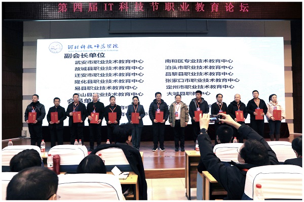 会上,张书华副会长授权成立河北省教育发展促进会计算机分会,副校长刘荣昌教授为赵立强教授颁发计算机分会会长证书,会长赵立强教授为定州市职业技术教育中心、迁安市职业技术教育中心等来自省内11个地区的12所职教中心授权为分会副会长单位。计算机分会成立职业教育计算机虚拟教研室。