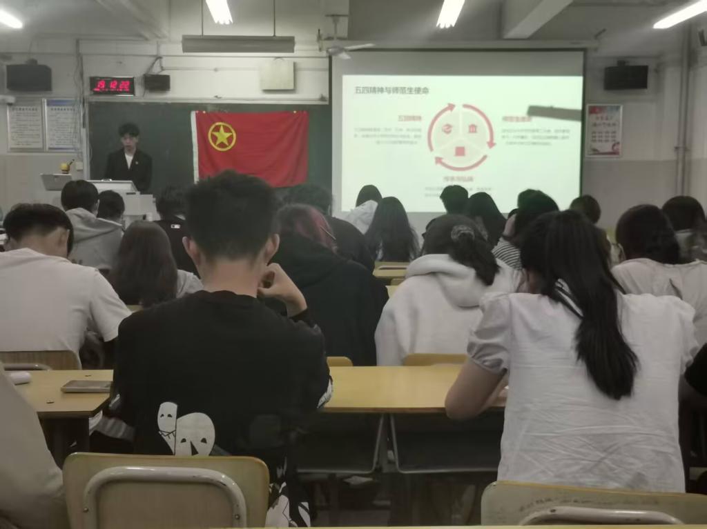 活动在激昂团歌中启幕,全体同学齐声高唱,尽显青春朝气。紧接着,团支书带来“五四精神与师范生使命”微团课,深入解读“爱国、进步、科学、民主”的核心要义,着重强调五四精神中伟大的爱国主义情怀,为同学们点明精神传承的方向。随后,班主任老师通过华罗庚、陈景润、苏步青等数学家投身教育、报效祖国的传奇故事,将五四精神与师范生的教育理想深度融合,为整场活动奠定了坚实的思想基础。